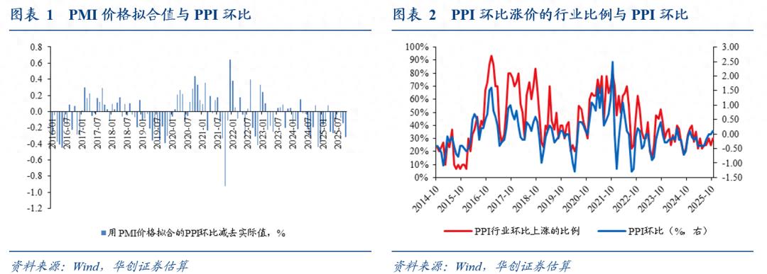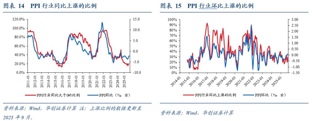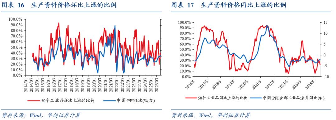 我们认为,这种背离背后体现的是,不同经济环境下,PPI价格变动的“广度”与“高度”的差异。本质上来看,PMI出厂价格更多体现的“广度”,调查行业中价格上涨的行业越多,PMI价格越高,是一个范围性指标;而PPI环比则体现的是“高度”,是一个幅度性指标。自2016年有PMI数据以来,在经济筑底回升初期和增长压力相对较大的时期,行业价格普遍偏弱,涨价集中在少数行业、并未扩散,以PMI价格推测的PPI环比基本上都弱于实际值,比如2016年上半年、2024年下半年以来在经济增长向好的时期,涨价趋势性扩散,行业价格普遍上涨,以PMI价格推测的PPI环比基本上都高于实际值,比如2017-2018年、2020下半年至2021年。这一现象,也可以从我们计算的PPI环比涨价的行业比例中可以看到,比如最近三个月PPI环比改善,但涨价的行业数量相比今年前7个月基本上并未增多。