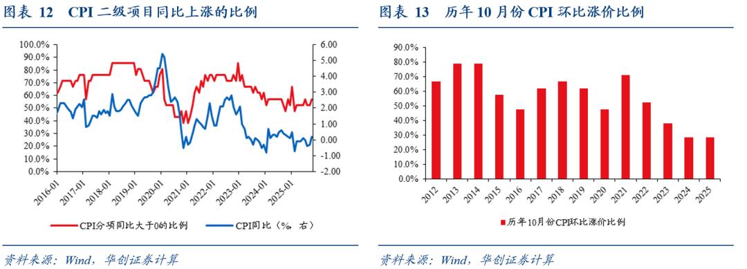 核心CPI中,核心商品同比从1.8%升至2%,涨幅连续第6个月扩大,“其中金饰品和铂金饰品价格分别上涨50.3%和46.1%;扩内需等政策效应继续显现,家用器具、文娱耐用消费品和家庭日用杂品价格涨幅在2.4%—5.0%之间,燃油小汽车价格降幅收窄至2.3%”。房租同比从0%下行至-0.1%。预计不含房租的核心服务价格同比从0.9升至1.2%,其中,“飞机票和宾馆住宿价格分别上涨8.9%和2.8%;医疗服务和家政服务价格分别上涨2.4%和2.3%”。