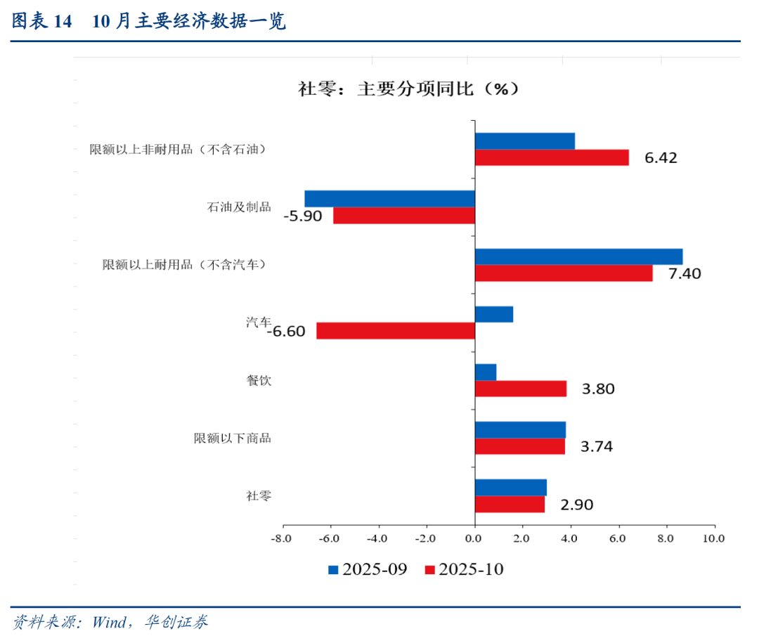 1)以旧换新相关商品,受基数抬高影响,本月增速回落较多。家电,10月同比为-14.6%,前值为3.3%;汽车,10月同比为-6.6%,前值为1.6%。限额以上耐用品整体增速为-1.0%,前值为4.1%。若剔除汽车,10月限额以上耐用品为7.4%,前值为8.64%。