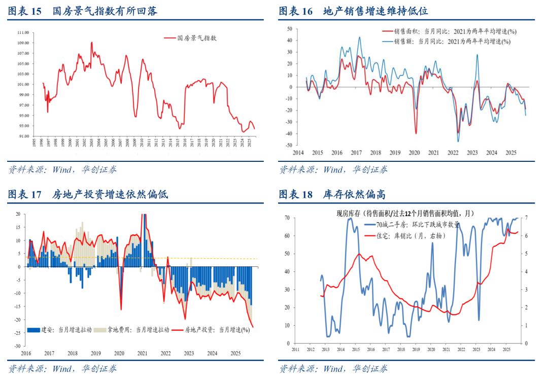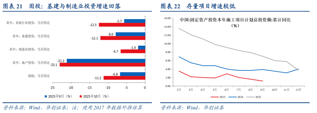 1)生产性投资:以制造业投资尤其是中游投资代表生产性投资。生产性投资的回落,我们认为是中期物价供需走向均衡的必要条件。10月,制造业投资增速继续回落,当月同比降至-6.7%,前值为-1.9%。累计增速来看,1-10月,制造业投资累计同比为2.7%,前值为4.0%。制造业投资内部来看,中游投资下降较快,1-10月,中游(数据公布原因,暂不含仪器仪表)累计增速为1.43%,低于制造业整体增速,或与反内卷有关。此前2024年、2023年、2022年、2021年连续四年中游投资增速均好于制造业整体。