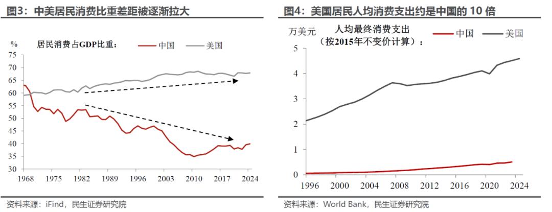 普遍观点认为,与发达经济体相比,我国消费水平存在显著差距——以“消费大国”美国为例,其居民消费率不断拉大与我国的差距,人均消费支出约是我国的10倍。不过通过比较两国的消费“口径”,我们还是能“挤出不少水分”,以及发现一些有趣的问题: