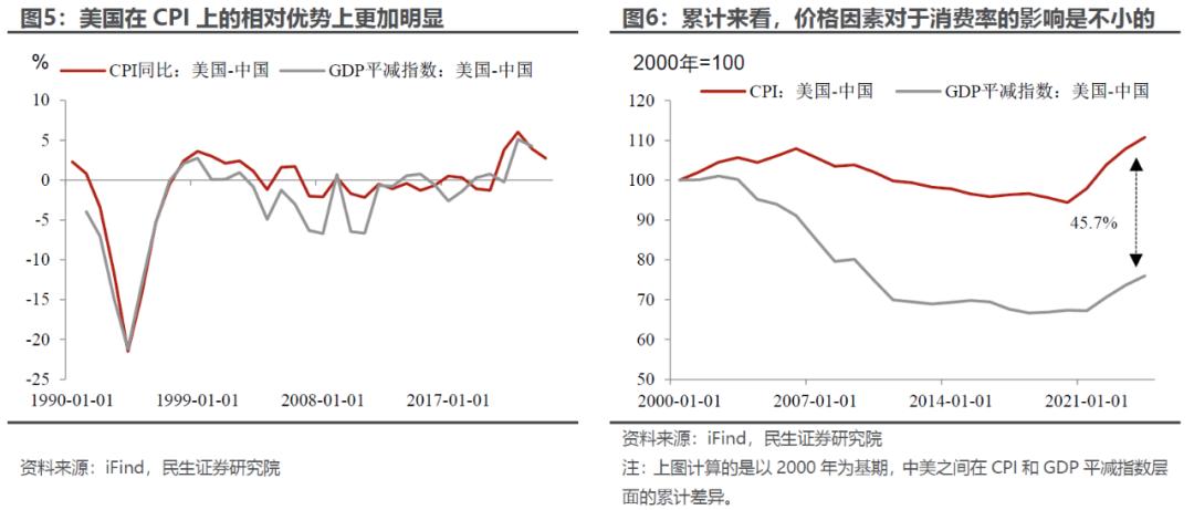 首先,其实价格问题很重要,美国消费率存在“价格优势”。直接从消费率(消费/GDP)入手,我们可以比较中美在CPI和GDP平减指数上的差异,相较于“分母端”的GDP平减指数,美国在“分子端”的CPI更有优势;或者换一种说法,和中国整体的价格水平相比,中国居民消费端的价格相较海外是偏低的。