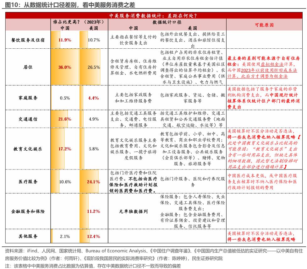 三是在自有住房服务价值的统计上,经历了从“核算方法”到“市场环境”的双重挑战。我国在2023年前对自有住房服务消费采用“折旧成本法”核算,该方法仅反映房屋自身价值损耗,未能充分体现住房的实时使用价值,客观上造成了2023年前中国服务消费规模的低估。不过自2023年调整为国际通行的“虚拟租金法”后,按市场价格衡量自由住房租金,可以修正居民实际享有的住房服务价值。