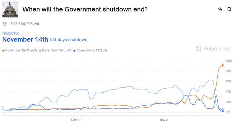 根据博弈网站 Polymarket 的预测,本周五前政府重新开门的概率高达九成,市场信心迅速回温,昨日美股与加密货币同步领涨。